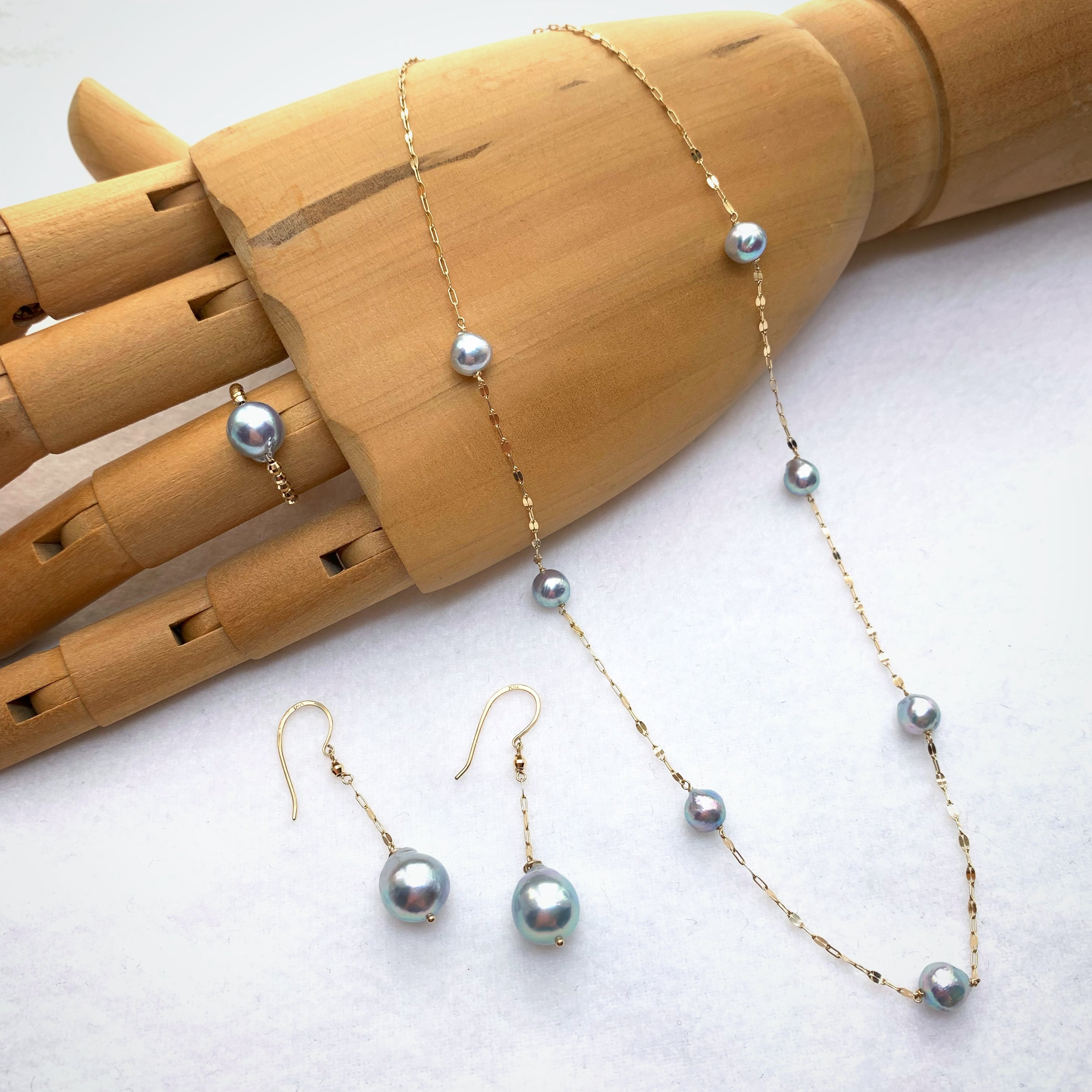 ③ K10YG/あこや真珠(ブルーグレー)バロックステーションネックレス